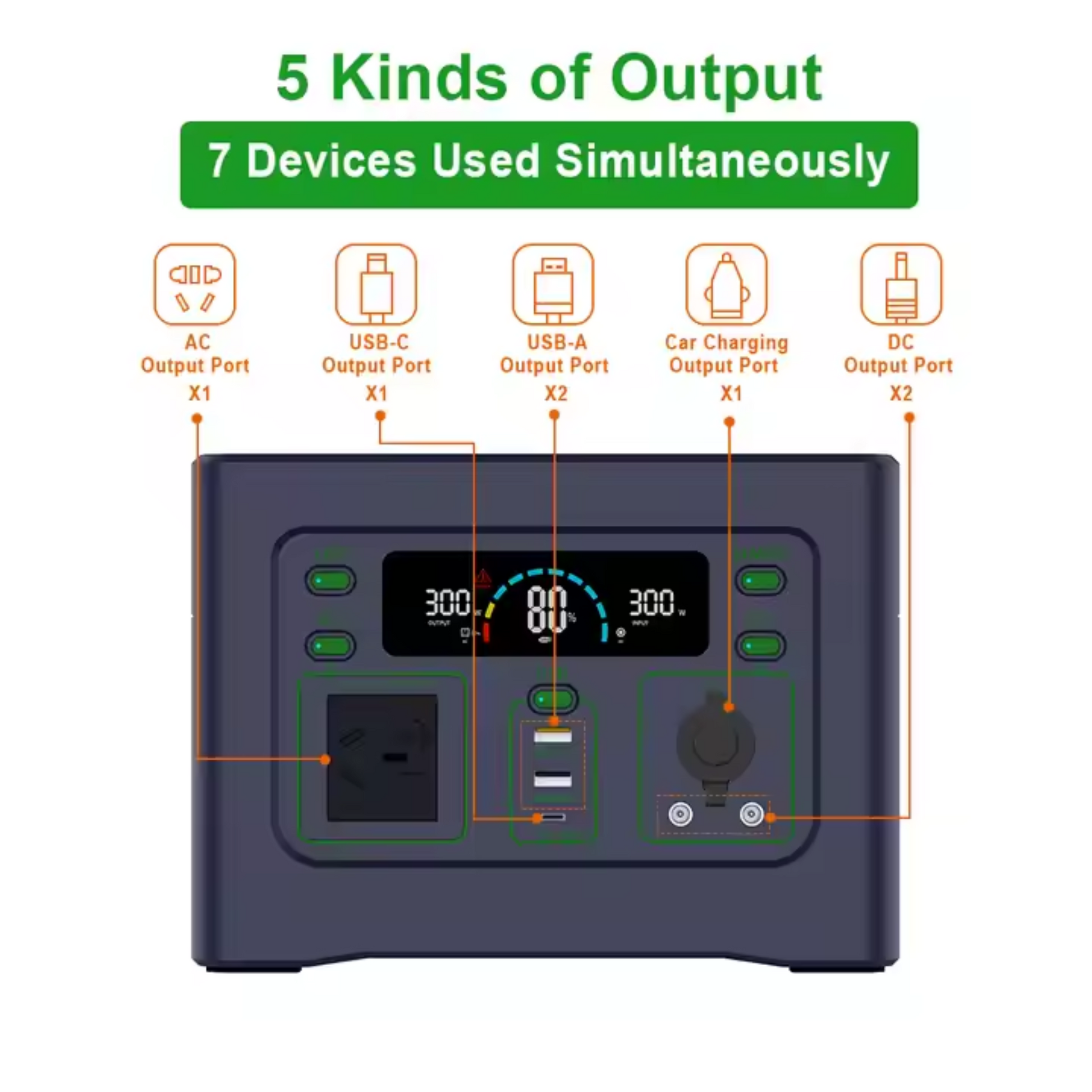 Ports: 1x AC outlet, 3x USB-A, 1x USB-C, 12V carport, DC port